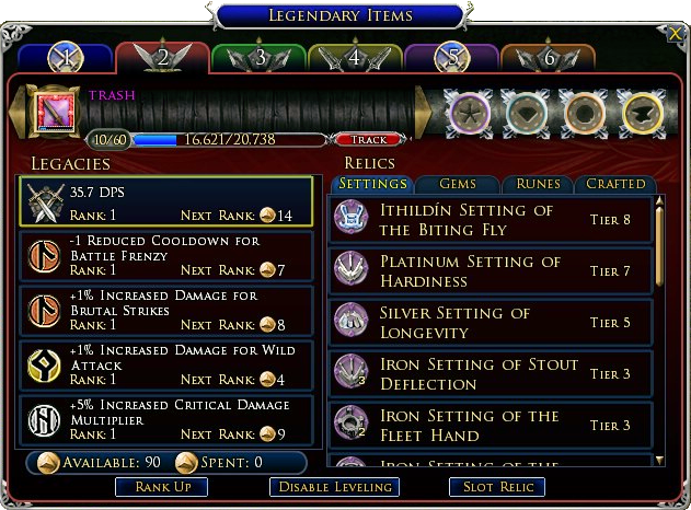 Also, do not ignore the opportunity of using the TRADE channel to broadcast swaps for those LI's that you cannot use. I've found this quite useful as every player needs LI's for DC'ing (DeConstructing). Exchange these for the appropriate LI, apply the 650 XP Rune which will raise the weapon to level 3 and DC. This will result in you getting at minimum of thee Tier 1 relics, but more often than not, (more). Especially if you get a CS (Critical Sucess) where it's possible to get combination of relics from Tier 4, perhaps a couple of Tier 3, and a few Tier 2's and Tier 1's - all from that simple level 3 DC. In my experience there is NO advantage in taking an item any higher when you are only grinding relics, HOWEVER, if you also want to level a weapon FASTER, then level your LI's to level 11, which requires about 20,000 XP. However, I'm getting ahead of myself.